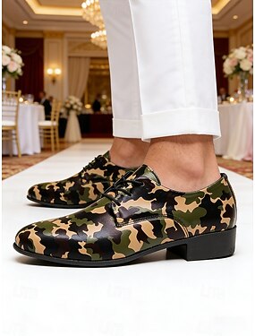 Zapatos Oxford de piel sintética con estampado de camuflaje para hombre, estilo informal con cordones para estilo urbano, festivales de música, uso diario y bodas.
