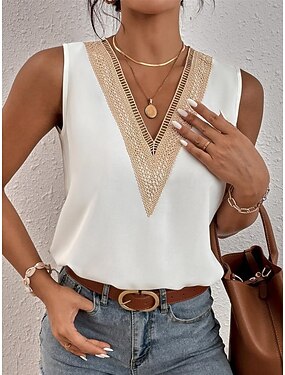 Camiseta sin mangas para mujer blusas para salir tops de concierto negro blanco azul simple patchwork encaje sin mangas fiesta diaria básica sexy escote corazón regular S