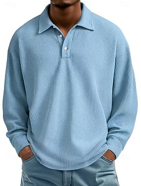 Hombre Camisetas polo con diseño de gofre Casual Calle Escote en Pico Cuello de gaviota Manga Larga Moda Básico Color sólido Bloque de Color Primavera & Otoño Otoño invierno Ajuste regular Negro Azul