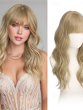 Pelucas rubias con flequillo - Peluca sintética de 50 cm de largo, suave, ondulada, de aspecto natural y resistente al calor para mujer, ideal para fiestas y uso diario, color rubio ceniza.