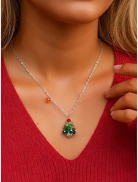 Joyería navideña acrílica para mujer: collar y pendientes festivos con forma de árbol y lazos rojos, perfectos para fiestas y celebraciones navideñas.