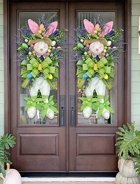Paquete de 2 coronas grandes de conejito de Pascua para puerta de entrada, colgante de conejo artificial de primavera de 61 cm con huevos de lavanda y lazos verdes, decoración rústica de Pascua para pared de porche, bonita decoración navideña para exterio