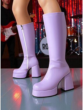 Botas go-go blancas de charol brillante para mujer, con tacón grueso, estilo disco mod de los 80, perfectas para fiestas retro, eventos de disfraces y salidas nocturnas.