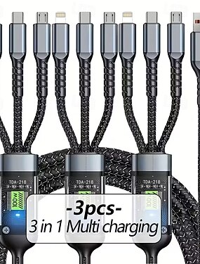 Cable de carga rápida universal (paquete de 3), cable multicarga trenzado de nailon QC3.0 con conectores Lightning, Micro USB y USB-C para varios teléfonos inteligentes.