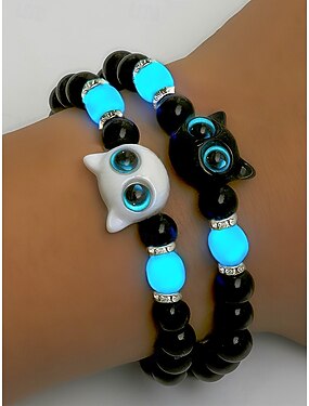 Pulsera de cuentas de gato que brilla en la oscuridad para Halloween para mujer: linda pulsera elástica con dije de gatito blanco y negro, joyería para fiestas, cosplay y regalos.