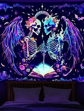 Tapiz de calavera psicodélico con luz negra, reactivo a los rayos UV, tapiz de esqueleto gótico para colgar en la pared, póster de fiesta con alas de neón de fantasía que brilla en la oscuridad, tapiz
