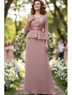 Funda Columna Hasta el Suelo Vestido Invitada Boda Vestido formal Vestido de noche Vestido de Madrina Manga Larga Cuello Barco Elegante Sencillo Formal Gasa con Cinta / Lazo Volantes