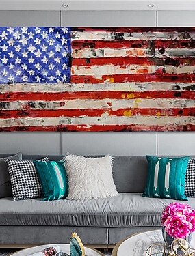 Pintura al óleo hecha a mano, lienzo, arte de pared, decoración, estrellas, rayas, bandera estadounidense para decoración del hogar, marco estirado, pintura colgante/pintura enrollada sin marco, sin