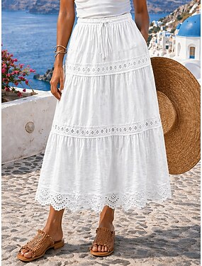 Mujer Falda de encaje Moda Casual Midi Alta cintura Faldas Plano Encaje Plisado Volante Elástico Diario Vacaciones Blanco Verano