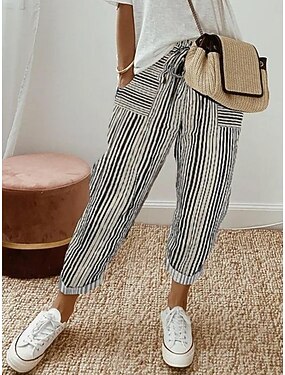 Mujer Lino de algodón sintético Perneras anchas Pantalones Pantalones casuales Vacaciones Moda Ropa de calle Hasta el Tobillo Alta cintura A Rayas Bolsillo Cintura elástica A Rayas Comodidad Cómodo