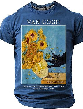 Camiseta de manga corta informal con estampado de girasoles de Van Gogh y un divertido gato negro, estilo impresionista, regalo para amantes de los gatos, edición especial. Tallas: S, M, L, XL, XXL,