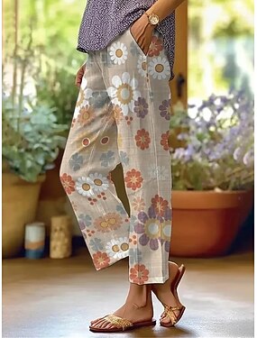 Pantalones de Mujer de Lino Tipo Pantalones Rectos Vacaciones Moda Streetwear Largo Completo Cintura Media Floral Gráfico Bolsillo Cintura Elástica Impresión Cómoda Confort Transpirabilidad