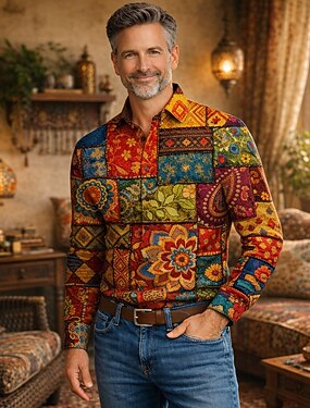 Retro Antiguo Años 70 Camisas Camisa hawaiana Larga Hippie Étnico Disfraz Hombre Mascarada 4 de julio Festival de Música Fiesta Ropa Cotidiana Adulto Camisas