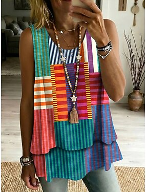 Mujer Camiseta sin mangas Retazos Multi capa Estampado Graphic Geometría Elegante Casual Sin Mangas Cuello Barco Tops regulares Casual Diario Azul Piscina Amarillo Rojo Morado Verano Primavera