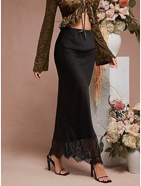 Mujer Faldas de satén Elegante Vintage Moda Casual Midi Alta cintura Faldas Plano Encaje Retazos Agujero Rígido Diario Oficina / Carrera Negro Verano
