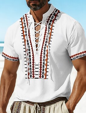 Hombre Diseño Geométrico Étnico Camisa Camisa pirata con cordones Camisetas tipo jersey Mangas cortas retro de la vendimia Casual Diario vacaciones en la playa Verano Primavera Escote Chino Impresión