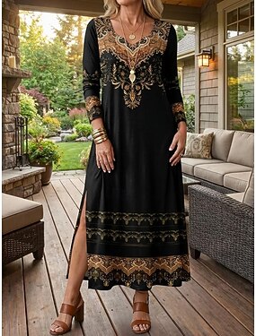 Mujer Vestido Midi Vestido vintage Vestido estilo camiseta Vestido bohemio Elegante Retro Casual Diario Vacaciones Delgado Plano Manga Larga Cuello Barco Negro Invierno Otoño
