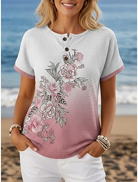 Mujer Camiseta Estampado Botones del pecho Floral Graphic Elegante Moderno Casual Manga Corta Henley Tops regulares Diario Azul Piscina Amarillo Rosa Morado Verde Trébol Verano Primavera