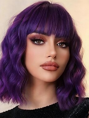Peluca morada con flequillo, suave, corta, ondulada, sintética, hasta los hombros, rizada, ideal para Halloween, cosplay y uso diario.