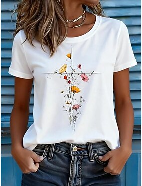 Mujer Camiseta Estampado Floral Graphic Vintage Elegante Clásico Manga Corta Cuello Barco Escote Redondo Tops regulares Casual Diario Azul Piscina Blanco Azul Real Verano Primavera