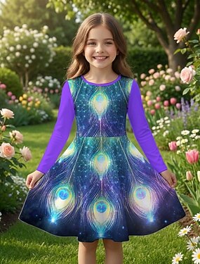 Girls ' 3D Graphic Pavo real Vestido Manga Larga Impresión 3D Primavera Otoño Diario Vacaciones Fiesta Casual Princesa Hermosa Niños 4-12 años Vestido informal Vestido de una línea Hasta la Rodilla