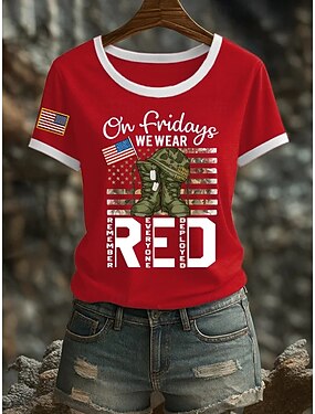 Camiseta roja de mujer para el viernes, con estampado de camuflaje, letras, estilo clásico, informal, manga corta, cuello redondo, tops regulares, para uso diario, para salir, fin de semana, rojo,