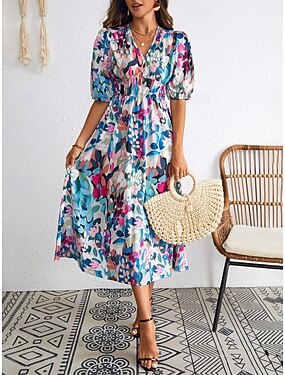 Mujer Vestido Midi Vestido informal Vestido de flores Elegante Moda Moderno Exterior Vacaciones Noche Ajuste regular Floral Manga Corta Escote en Pico Azul Piscina Negro Verde Claro Rojo Verano