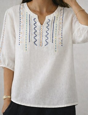 Camiseta bohemia de 100% algodón para mujer camiseta de lino camiseta bordada vintage elegante étnica de media manga de manga de linterna cuello en V regulares para el día salir blanca roja verde