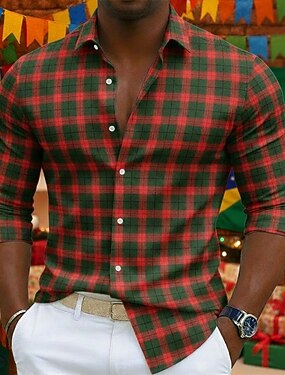 Camisa de carnaval de Brasil para hombre: camisa informal de cuadros rojos y verdes con estampado festivo.