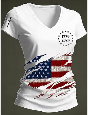 día de la independencia americana Mujer Camiseta Estampado Graphic Bandera Vintage Elegante Clásico Manga Corta Escote en Pico Tops regulares Diario Rojo óxido Negro Blanco Rojo Verano Primavera