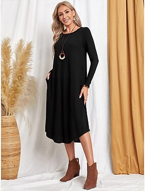 Mujer Vestido Midi Vestido estilo camiseta Vestido de cambio Casual Boho Diario Deportes Noche Holgado Plano Manga Larga Cuello Barco Negro Rojo Azul Piscina Gris Primavera Otoño Invierno