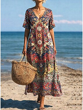 Mujer Vestido maxi Vestido de cambio Vestido de verano Vestido estilo camiseta Vacaciones Casual Boho Playa Fiesta Holgado Cachemir Étnico Manga Corta Escote en Pico Naranja rojo Verano Primavera