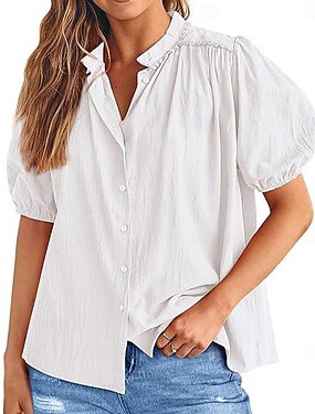 Mujer Camisa Camisa de manga corta Camisa de verano Camisa casual Color sólido Plano Vacaciones Vintage Moda Manga Corta Cuello Vuelto Tops regulares Ropa de calle Playa Festivos Blanco Verano