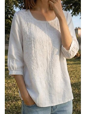 Mujer Camiseta Lino de algodón sintético Camiseta superior Bordado Floral Moda Étnico Casual Media Manga Cuello Barco Tops regulares Noche Ropa de vacaciones Verde Azulado Blanco Amarillo Morado Caqui