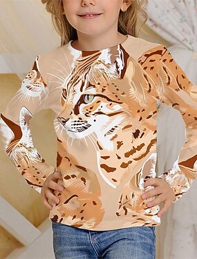 Chica 3D Animal Gato Camiseta Manga Larga Primavera Otoño Moda Básico Niños 4-12 años Cuello Barco Exterior Casual Diario Ajuste regular