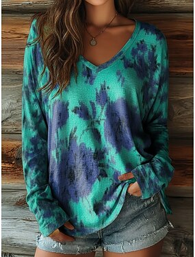 Mujer Camiseta Estampado Graphic Tie-dye Vintage Casual Boho Manga Larga Escote en Pico Tops regulares Diario Azul Piscina Verano Primavera Otoño