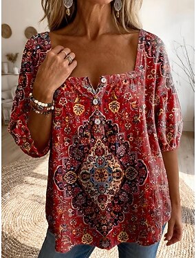 Mujer Blusa Estampado Graphic Geométrico Diario Elegante Casual Media Manga Escote Cuadrado Tops regulares Casual Diario Azul Piscina Blanco Vino Verde Trébol Verano Primavera