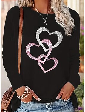Camiseta de Corazón de San Valentín para Mujer Bonita Camiseta Roja Tops Regulares de Manga Larga Cuello Redondo Impresión Ajuste Regular Fin de Semana de San Valentín Negro Rosa Rojo Primavera y