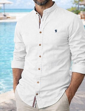 Hombre Camisa camisa de lino Camisa con cuello mao Camisa de verano Ropa de playa Plano Casual Diario Blanco Azul Piscina Caqui Manga Larga Cuello Primavera verano Ropa
