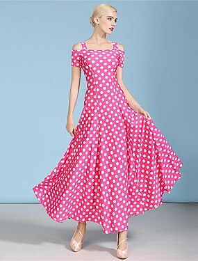 Vestido de baile de salón con lunares y hombros descubiertos para mujer: corte en A para competiciones, baile latino y eventos de baile, color rosa. & blanco