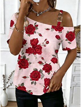 Mujer Camiseta Camiseta superior Estampado Floral Graphic Elegante Moda Clásico Manga Corta Un Hombro Tops regulares Diario Noche Fin de semana Blanco Rosa Morado Verde Trébol Verano Primavera
