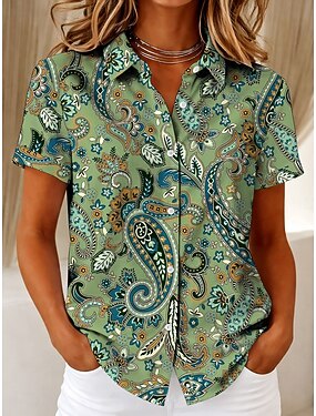 Mujer Camisa Botones Estampado Graphic Cachemir Vintage Elegante Moderno Manga Corta Cuello Camisero Tops regulares Casual Diario Verde Claro Marrón claro Morado Marrón Verde Trébol Verano Primavera