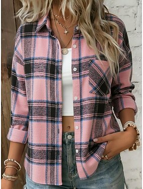 Mujer Camisa Camisa con botones Camisa casual Blusa Botones Plaid Elegante Clásico Moderno Manga Larga Cuello Camisero Tops regulares Diario Festivos Noche Azul Piscina Rosa Vino Verano Primavera
