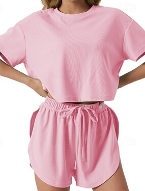 Mujer Conjuntos de dos piezas Conjuntos de pantalones cortos Manga Corta Cuello Barco Color sólido Moda Ropa de calle Casual Diario Exterior Verde Claro Rosa Verde Trébol Verano Ajuste regular