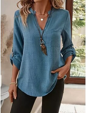 Mujer Blusa Camisa de lino sintético Bolsillo Color sólido Diario Básico Casual Manga Larga Escote en Pico Tops regulares Diario Negro Azul Real Verde Trébol Caqui Albaricoque Verano Primavera Otoño