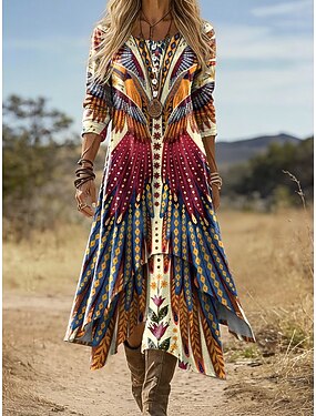 Mujer Vestido hasta la Rodilla Vestido vintage Vestido informal Vintage Ajuste regular Boho Graphic Manga Larga Escote en Pico Azul Piscina Morado Naranja Verde Trébol Verano Primavera