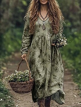 Mujer Vestido largo maxi Vestido bohemio Vestido vintage Vestido informal Vintage Diario Exterior Vacaciones Ajuste regular Floral Manga Larga Escote en Pico Verde Trébol Primavera Otoño