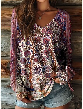 Camiseta Boho para mujeres Gráfica Plantas Tribal Vintage Estilo Clásico Manga Larga Cuello en V Tops Regulares Diarios Impresión Azul Verde Claro Vino Azul Marino Fucsia Primavera Otoño Invierno