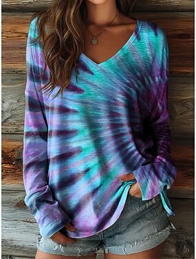 Mujer Camiseta Estampado Ombre Graphic Gradiente de Color Vintage Elegante Clásico Manga Larga Escote en Pico Tops regulares Diario Fin de semana Azul Piscina Verano Primavera