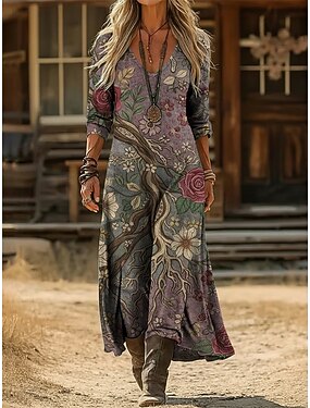 Mujer Vestido largo maxi Vestido bohemio Vestido vintage Vestido informal Vintage Diario Exterior Vacaciones Ajuste regular Floral Manga Larga Escote en Pico Negro Verde Ejército Azul Marino Morado